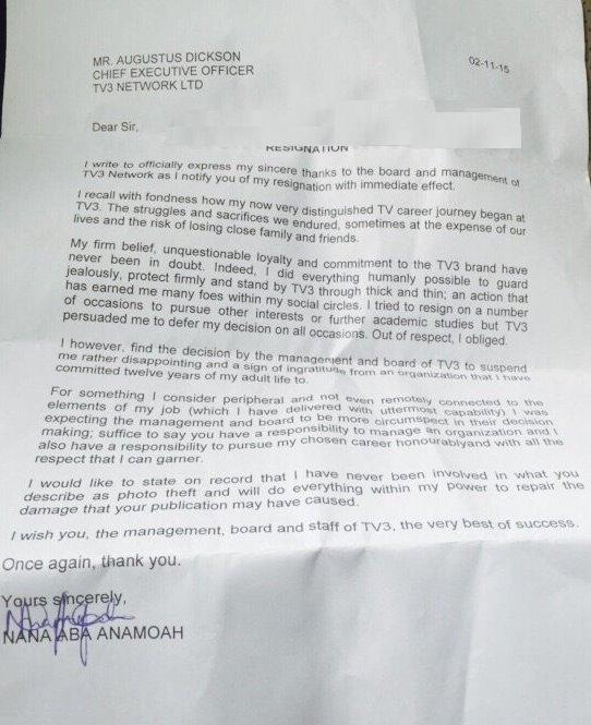Below is a copy of Nana Aba’s resignation letter