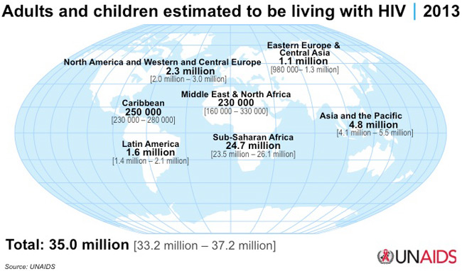 - According to the World Health Organization (WHO), there were approximately 35 million people worldwide living with HIV/AIDS in 2013. Of these, 3.2 million were children (<15 years old).