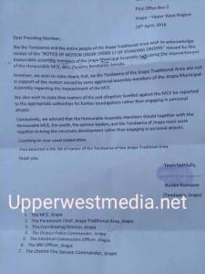 “We the Tendamba and Traditional People of Jirapa Traditional Area wish to acknowledge receipt of ‘NOTICE OF MOTION UNDER ORDER 17 OF STANDING ORDERS’ Moved by the honourable members of the Jirapa Municipal Assembly indicating the impeachment of the Honourable MCE, Christine Bombanye Amadu.