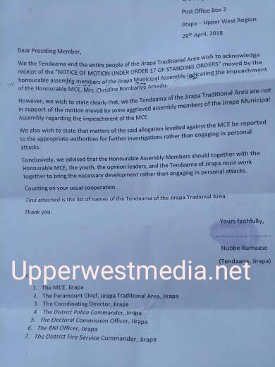 However, We wish to state clearly that we the Tendamba of Jirapa Traditional Area are not in support of the motion moved by some aggrieved Assembly members of the Jirapa Municipal assembly Regarding the Impeachment of the MCE.