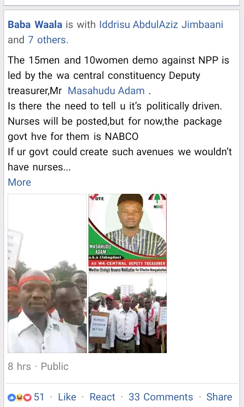 Masahudu Adams, representing the opposition National Democratic Congress as Deputy Treasurer posted pictures with a group of Nurses demonstrating on the street of Wa over what they referred to as government’s refusal to post nurses.