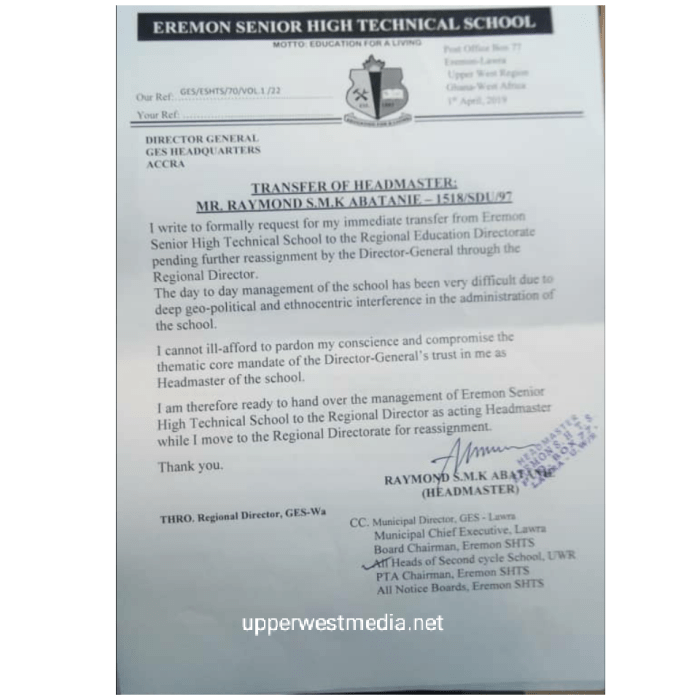 Headmaster of Eremon Senior High Technical School In Lawra municipality Simon K. Abatanie has written an official letter to the Regional Director for Education, Mr. Evans Kpebah, seeking to move from the School over what he termed Geo-Political and Ethnocentric interference in his line of duty.