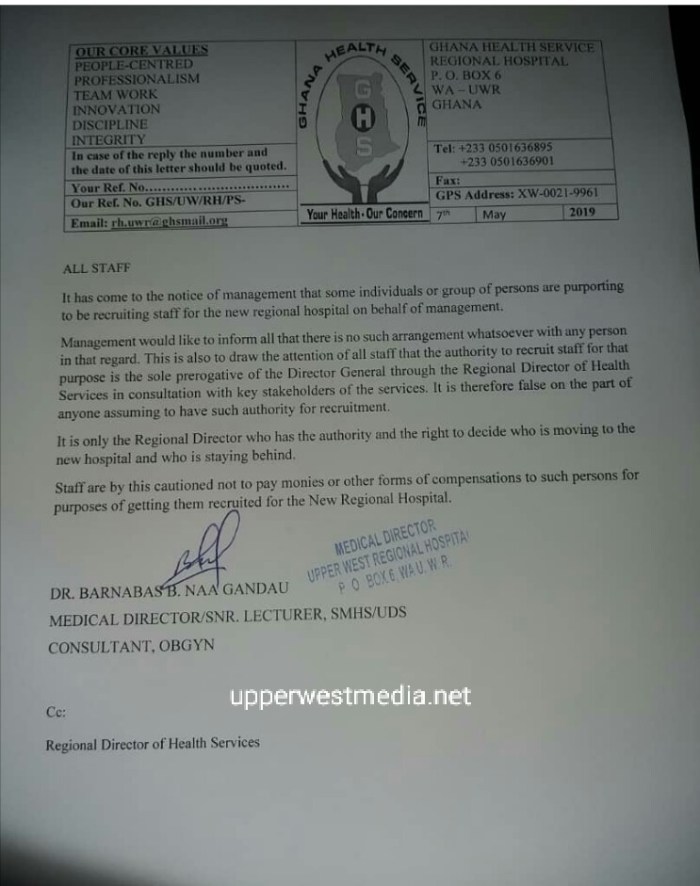 The Medical Director for Upper West Regional Hospital has cautioned desperate job seekers to be wary of false alarms circulating all over suggesting they are recruiting.