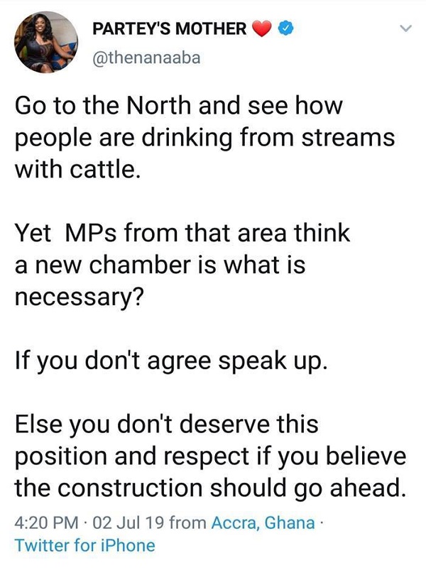 She said in the tweet “Go to the North and see how people are drinking from streams with cattle. Yet MPs from that area think a new chamber is what is necessary? If you don’t agree speak up. Else you don’t deserve this position and respect if you believe the construction should go ahead”