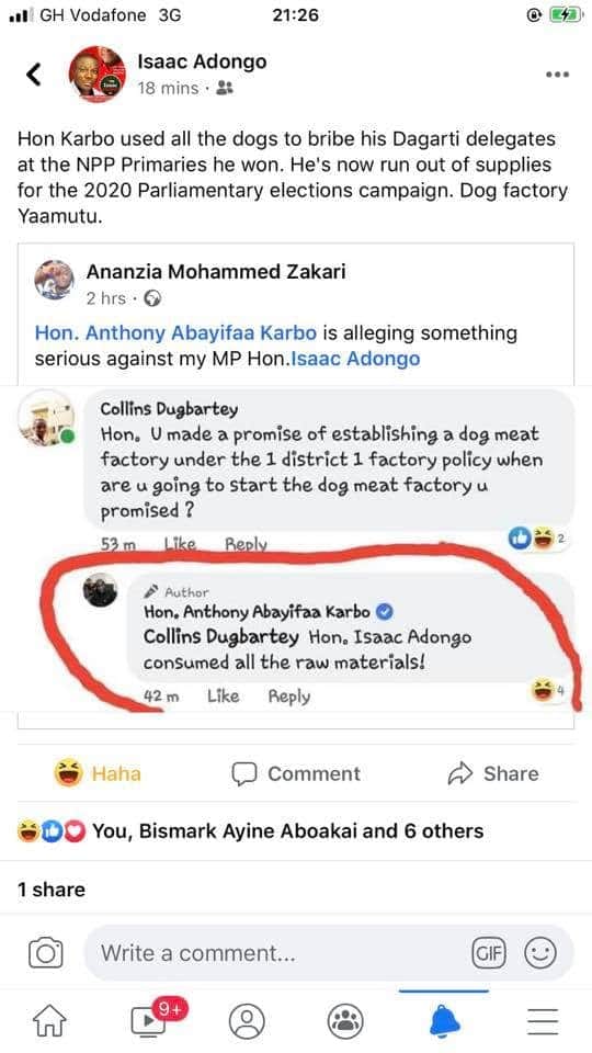 But barely three years after the vetting, the Bolgatanga Central lawmaker reminded his colleague of the promise to the people of the region saying “Hon Karbo used all the dogs to bribe his Dagarti delegates at the NPP Primaries he won. He’s now run out of supplies for the 2020 Parliamentary elections campaign. Dog factory Yaamutu”