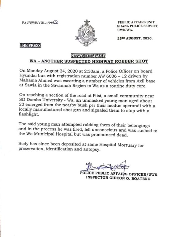 The said young man attempted robbing them of their belongings and in the process he was fired, fell unconscious and was rushed to the Wa Municipal Hospital but was pronounced dead. The Body has since been deposited at same Hospital Mortuary for preservation, identification and autopsy.
