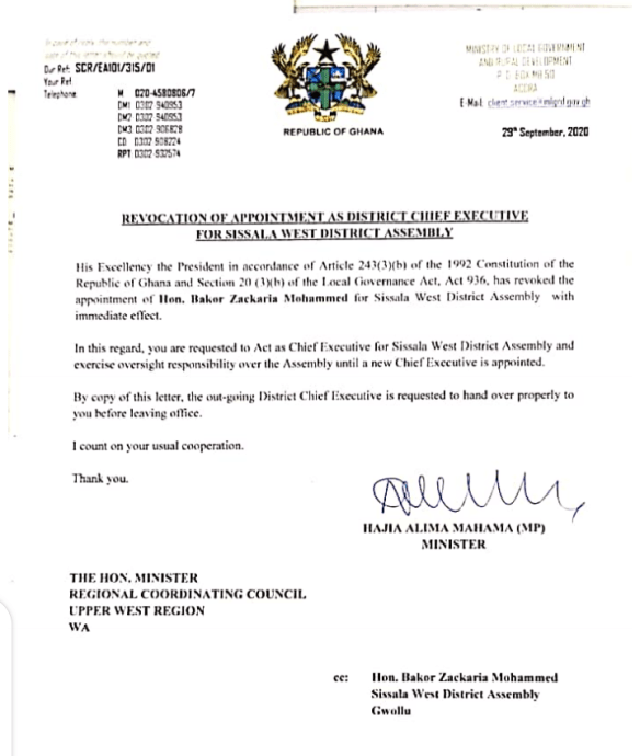 The District Chief Executive of Sissala West District Mr. Mohammed Bakor in a letter dated 29th september 2020 has been asked to step aside in a letter signed by the minister for local government and rural development Hajia Alima Mahama.