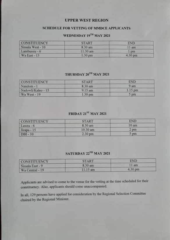 In a List of 129 for Upper West, Mr. Ali Bukari is part of the 18 Members who have applied including the Incumbent District Chief Executive, Mr. Sabo Labiir.