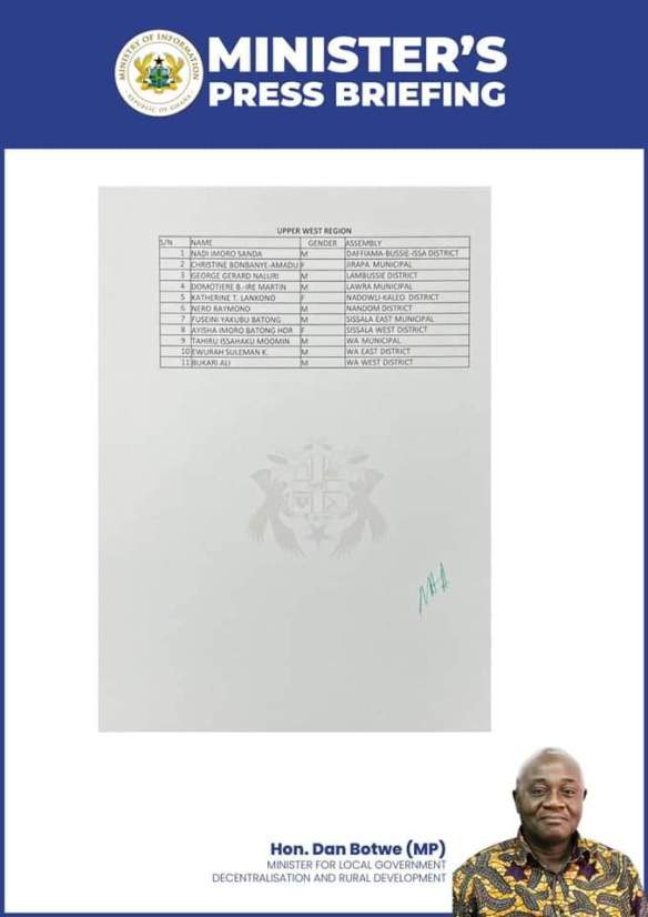 The Ministry of Local Government headed by Mr. Dam Botchwey has released the List of People approved by the President to be MMDCEs for the Upper West Region.