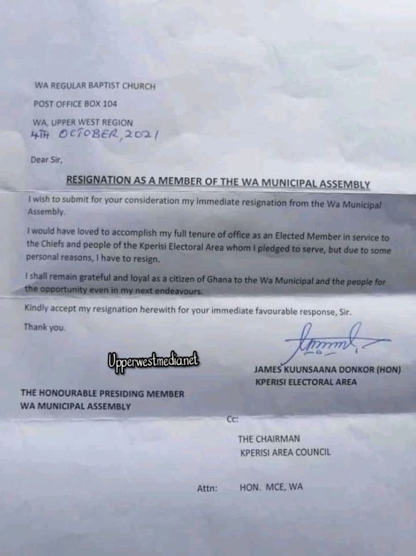 I shall remain grateful and loyal as a citizen of Ghana to the Wa Municipal and the people for the opportunity even in my next endeavours. Kindly accept my resignation herewith for your immediate favourable response, Sir.”