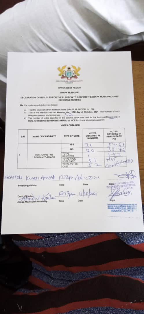 The MCE nominee, Madam Christin Bombanye Amadu who was also a Tutor at Wa SHS, secured 31 Yes votes, 20 No votes and 1 Rejected Vote in the second round of voting.She had previously Secured Yes= 31 No=21 Rejected=1 Total votes cast = 53 Making her unable to get the confirmation.
