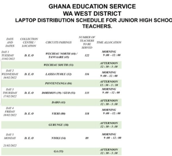 The Wa West District Education Office is set to Distribute TLM Laptops to teachers within the District Beginning 15th of February 2022. The Process is expected to last for 5 Working Days.
