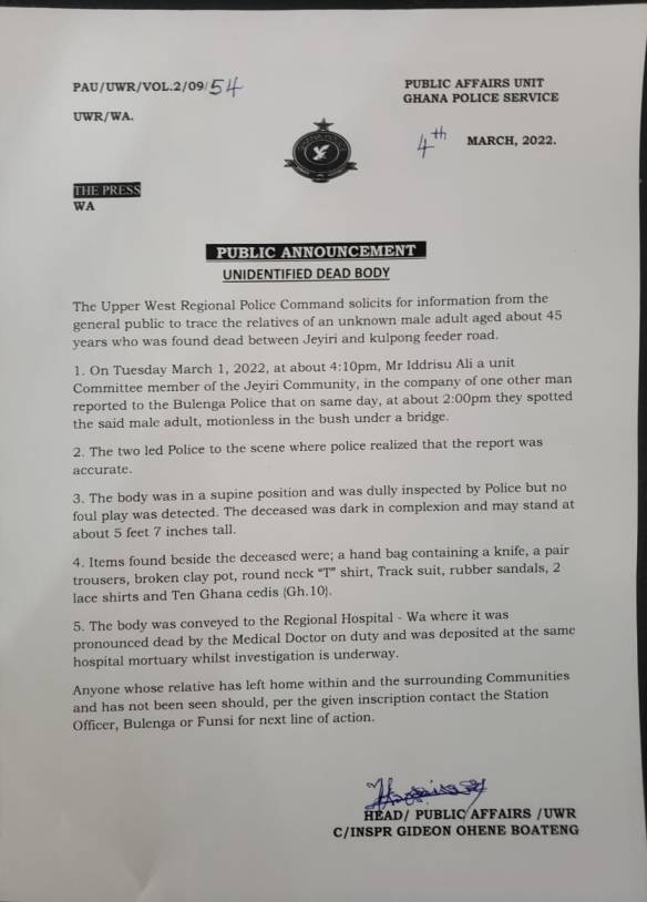 “On Tuesday, March 1, 2022, at about 4:10 pm, Mr. Iddrisu Ali a Unit Committee member of the Jeyiri Community, in the company of one other man reported to the Bulenga Police that on the same day, at about 2:00 pm they spotted the said male adult, motionless in the bush under a bridge.
