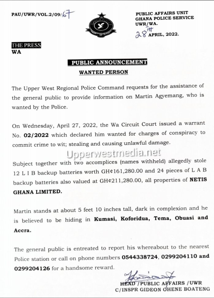 According to the Police Report Mr. Agyemang together with some individuals are on the Run and have been declared wanted by the Wa Circuit Court with warrant No. 02/2022 for stealing backup batteries worth Ghc 372,560.