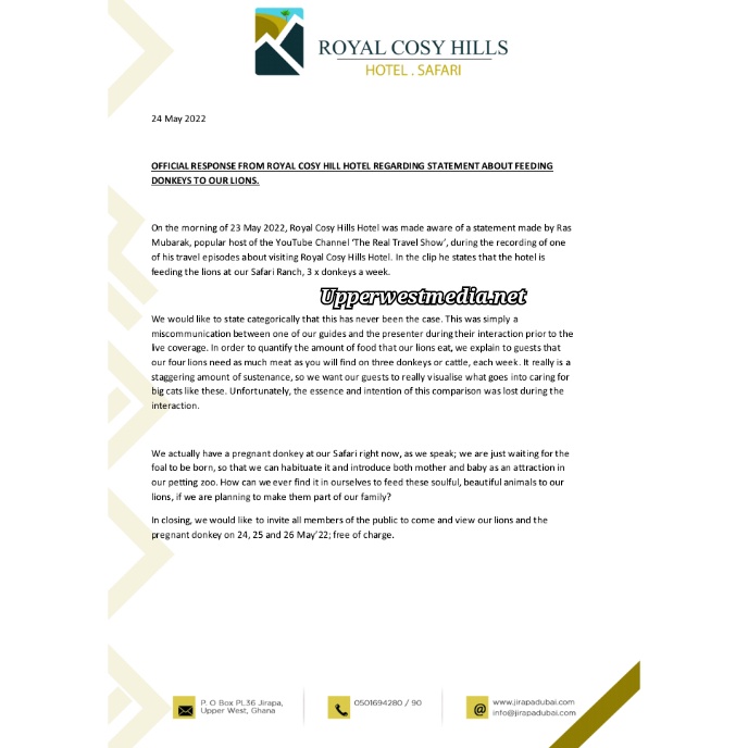 “On the morning of 23 May 2022, Royal Cosy Hills Hotel was made aware of a statement made by Ras Mubarak, popular host of the YouTube Channel ‘The Real Travel Show’, during the recording of one of his travel episodes about visiting Royal Cosy Hills Hotel. In the clip he states that the hotel is feeding the lions at our Safari Ranch, 3 x donkeys a week.