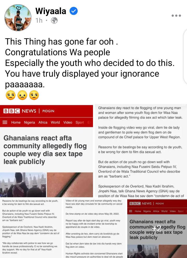 Award winning Artiste from Funsi in the Upper West Region, Noella Wiyaala has referred to the Recent flogging of two victims of a leaked sex video at the Wa Naa’s Palace as a sign of ignorance. She blamed the actions of the leaders and people of Wa for tarnishing the image of the Town and region at large in international platforms such as BBC.