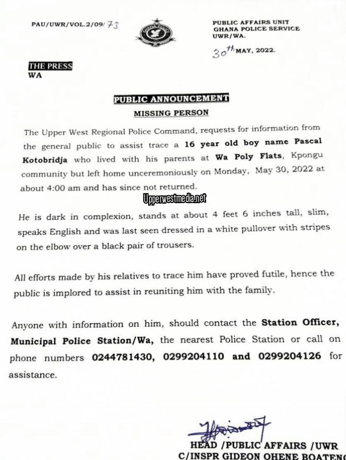The Upper West Regional Police Command, requests for information from the general public to assist trace a 16 year old boy name Pascal Kotobridja who lived with his parents at Wa Poly Flats, Kpongu community but left home unceremoniously on Monday, May 30, 2022 at about 4:00 am and has since not returned.