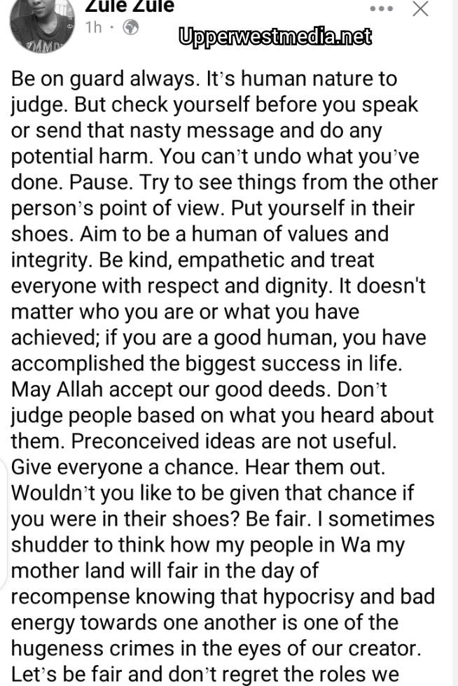 A Digital Designer from Wa and Based in Accra has noticed with regret how some of her people within Wa have resorted to backbiting, inheriting others enemies and judging people based on what they hear from others, In a post by Zule Zule, she urged well thinking residents who engage in such lifestyles to desist from the act and ensure to engage people to know their side of the story before judging them.
