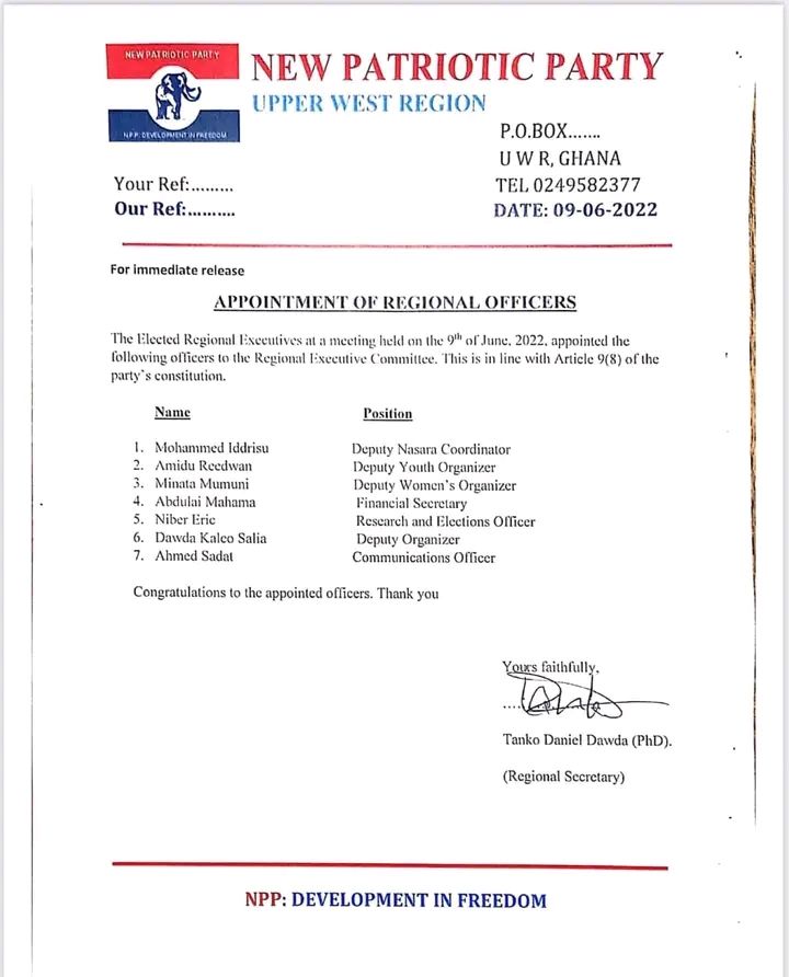 Upper West Regional Chairman of NPP Has Released list of Appointees to the various Regional Positions. This was in a letter dated 9th June 2022.