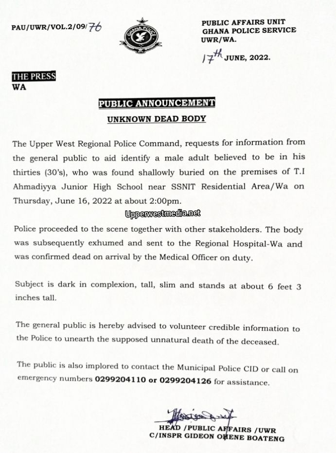 Upper West Regional Public Relations Unit, Headed By Chief Inspector Gideon Ohene Boateng has Issued a Statement concerning a dead body exhumed at T.I Ahmadiyya JHS Block B on the 16th of June 2022 by some students and Staff of the School.