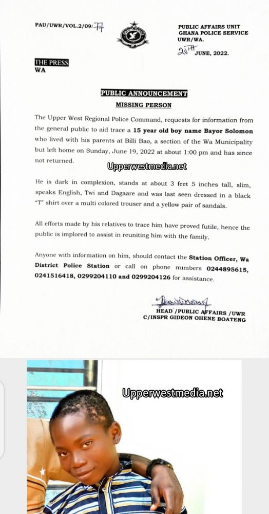 “The Upper West Regional Police Command, requests for information from the general public to aid trace a 15 year old boy name Bayor Solomon who lived with his parents at Billi Bao, a section of the Wa Municipality but left home on Sunday, June 19, 2022 at about 1:00 pm and has since not returned.