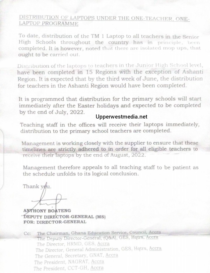 The Deputy Director General of Ghana Education Service(GES), Mr. Anthony Boateng has indicated in a Letter that All Junior High School Teachers in the Upper West Region have received their Laptop. He added that the Ashanti Region Alone is the Region that has someone of it’s staff being owed laptops.