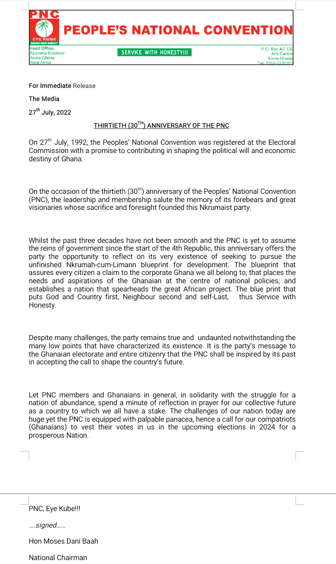 The People’s National Convention(PNC) According to the Party’s Chairman, Mr. Moses Dani Baah has attained 30 years since its establishment as a Political Party.