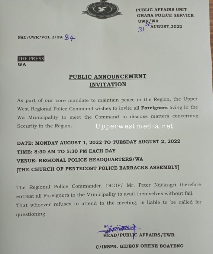 As part of our core mandate to maintain peace in the Region, the Upper West Regional Police Command wishes to invite all Foreigners living in the Wa Municipality to meet the Command to discuss matters concerning Security in the Region.