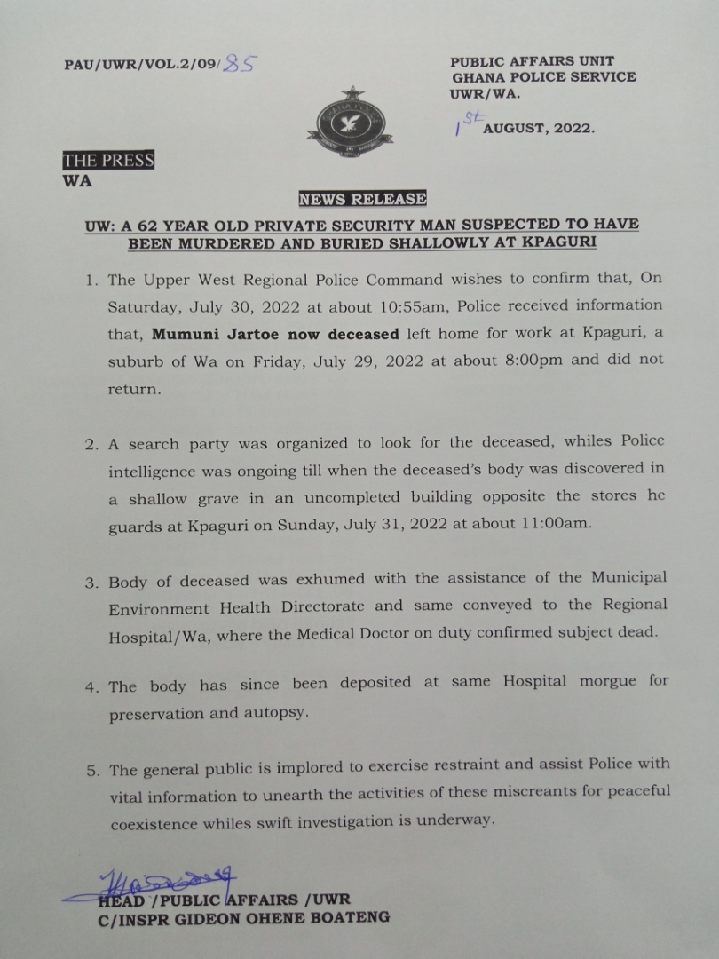 1. The Upper West Regional Police Command wishes to confirm that, On Saturday, July 30, 2022 at about 10:55am, Police received information that, Mumuni Jartoe now deceased left home for work at Kpaguri, a suburb of Wa on Friday, July 29, 2022 at about 8:00pm and did not return.