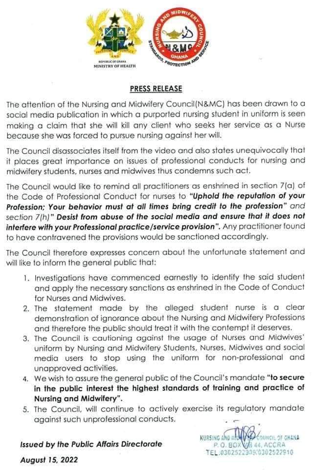The attention of the Nursing and Midwifery Council(N&MC) has been drawn to a social media publication in which a purporled nursing student in uniform is seen making a claim that she will kill any client who seeks her service as a Nurse because she was forced to pursue nursing against her will.