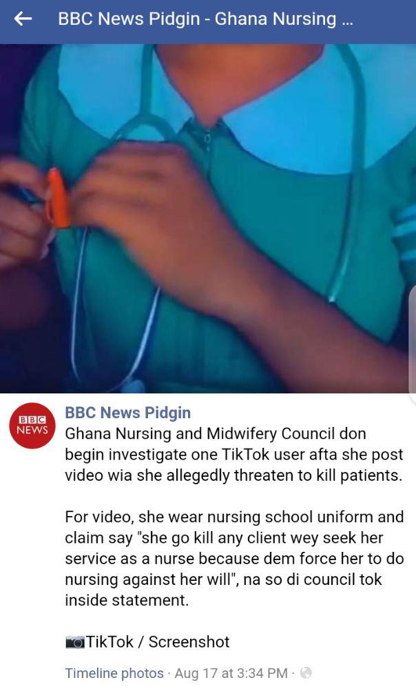Ghana Nursing and Midwifery Council don begin investigate one TikTok user afta she post video wia she allegedly threaten to kill patients.