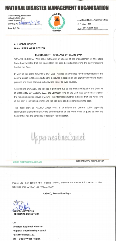 The Upper West Regional Office of National Disaster Management Organization (NADMO) headed by Mr. Ahmed Mustapha has in a letter dated 31st August 2022, cautioned Residents close to The Black and White Volta to be weary of rising levels of Water in the Back Volta as plans are far fetched to release excess water in Bagri Dam into the Back Volta.