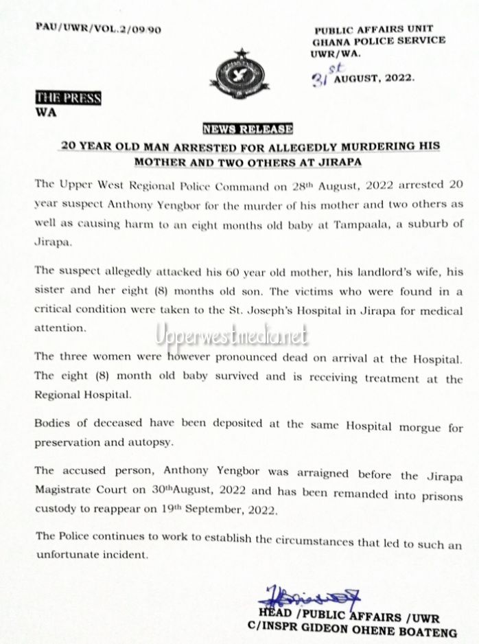 the Upper West Regional Police Command on 28th August, 2022 arrested 20-year old suspect Anthony Yengbor for the murder of his mother and two others as well as causing harm to an eight months old baby at Tampaala, a suburb of Jirapa.