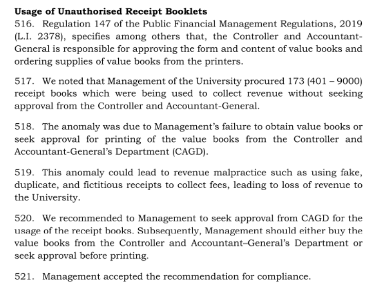 517. We noted that Management of the University procured 173 (401 9000)receipt books which were being used to collect revenue without seeking approval from the Controller and Accountant-General.