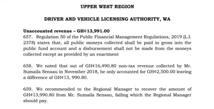The Auditor General stated that out of GH¢16,490.80 non-tax revenue collected by the Regional Manager, Sumaila Sensau in November 2018, only GH¢2,500 was accounted for leaving a difference of GH¢13, 990.80.