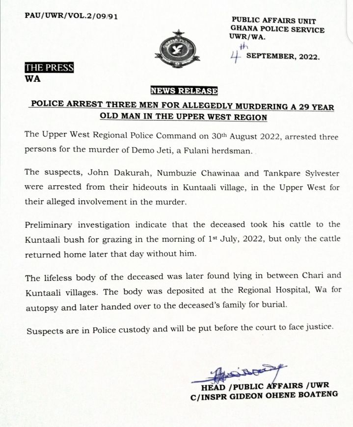 The Upper West Regional Police Command on 30th August 2022, arrested three persons for the murder of Demo Jeti, a Fulani herdsman.