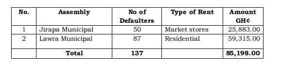 583. In breach of the above Regulations, our review of two Municipal Assemblies’ rent register revealed that managements failed to collect rent due from the occupants of the Assemblies’ residential accommodation and market stores resulting in rent arrears amounting to GH¢85,198.00.