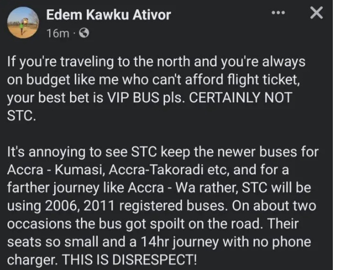 A passenger of Intercity State Transport Company (STC) has taken to social media to lament what he describes as disrespect to travelers going to the North of Ghana compared to travelers to Kumasi and Takoradi.