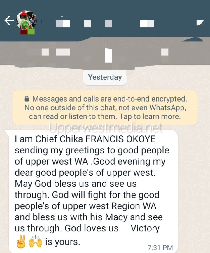 I am Chief Chika FRANCIS OKOYE sending my greetings to good people of upper west WA .Good evening my dear good people’s of upper west. May God bless us and see us through. God will fight for the good people’s of upper west Region WA and bless us with his Macy and see us through. God loves us. Victory ✌️🙌 is yours.