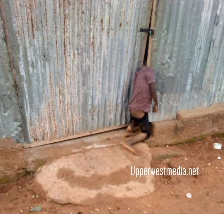“The entire Daffiama community woke up this morning to witness a very sad incident.This is a little boy in his teens traped in the main door of Amazing grace church.The deceased body has since been taking away by the police for further investigation and possibly burial.😭😭😭😭”