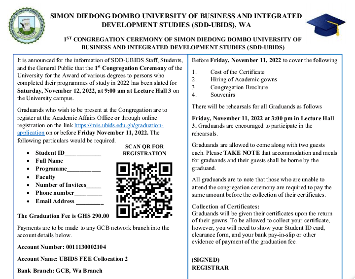 Graduands who wish to be present at the Congregation are to register at the Academic Affairs Office or through online registration on the link https://mis.ubids.edu.gh/graduation-