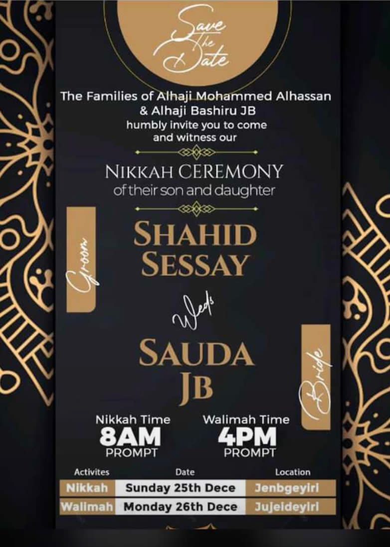 The Islamic Marriage will be held on 25th and 26th of December 2022. Nikah will be at 8am on the 25th of December 2022 at 8am in Jengbeyiri whilst Waliamah will take place on 26th of December 2022 at 4pm at same location.