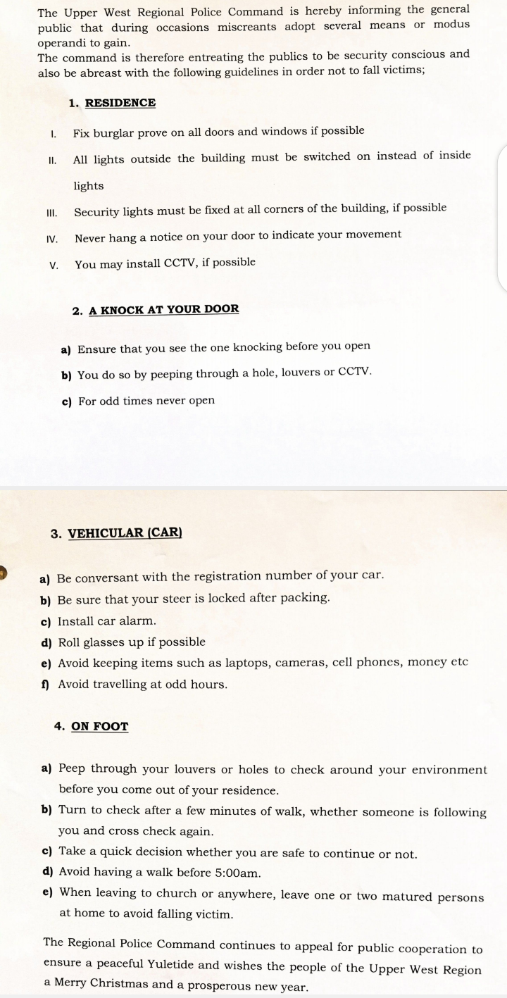 The Upper West Regional Police Command is hereby informing the general public that during occasions miscreants adopt several means or modus operandi to gain.