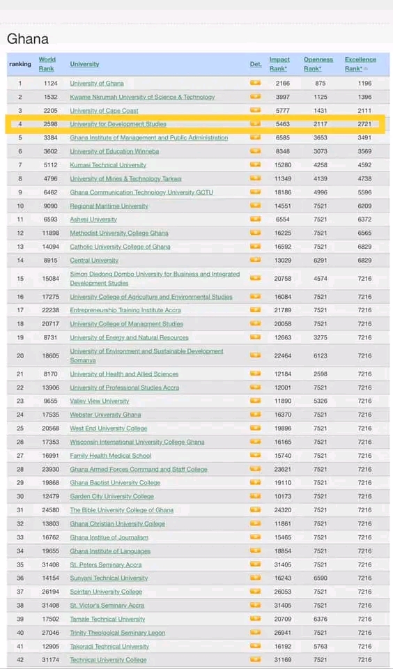 The University of Ghana Legon was ranked first in Ghana followed by the Kwame Nkrumah University of Science and Technology, University of Cape Coast Third, University for Development Studies fourth, Ghana Institute of Management and Public Administration Fifth and University of Education, Winneba Sixth.