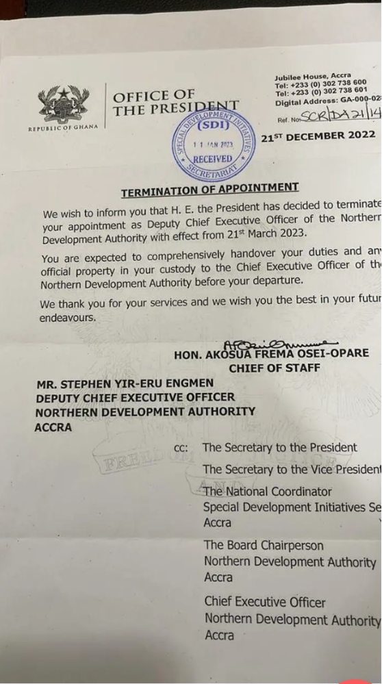 “We wish to inform you that, H. E. the President has decided to terminate your appointment as Deputy Chief Executive Officer of the Northern Development Authority with effect from 21st March 2023.”