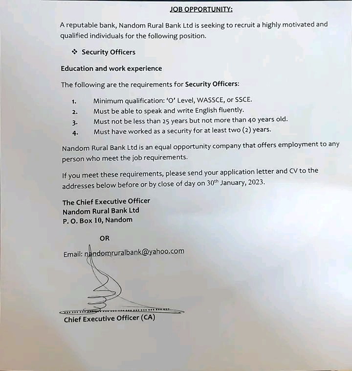 Nandom Rural Bank Ltd is an equal opportunity company that offers employment to any person who meet the job requirements.