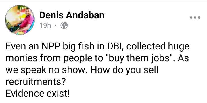 “Even an NPP big fish in DBI, collected huge monies from people to “buy them jobs”. As we speak no show. How do you sell recruitments?