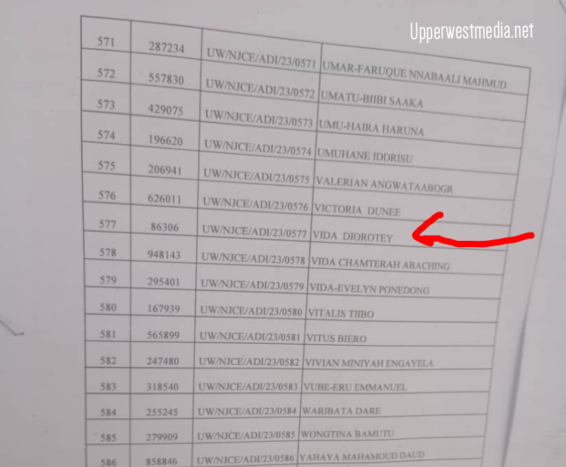 Name of the District Chief Executive was spotted as part of teaching staff set to write promotion exams at NJA College of Education to the Rank of Assistant Director I, The DCE with index number UW/NJCE/ADI/23/0577 and Staff ID : 86306 will be writing on the 28th of February 2023 at Nusrat Jahan Ahmadiyya College of Education as a Teaching Staff and as a District Chief Executive of Wa West.