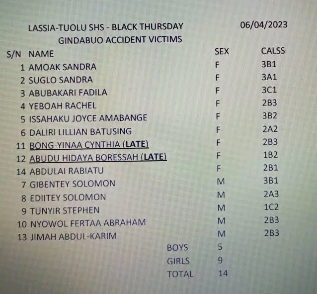 Two female students of Lassia-Tuolu Senior High School (SHS), Hidaya Seidu Abutu and a colleague lost their lives in a fatal car accident at Gindabuo in the Sawla-Tuna-Kalba District of the Savannah region.