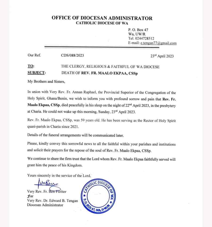Maalo Ekpaa, 59 years of age passed on Saturday, 22nd April 2023 in his sleep in a prestbytery at Charia Charia, a suburb of Wa Municipality.